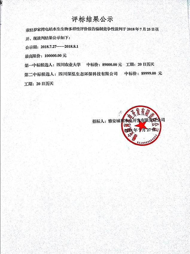 滎經羅家灣電站水生生物多樣性評價報告編制競爭性談判評標結果公示