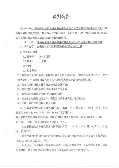 雅安城市建設(shè)投資開發(fā)有限公司辦公電子設(shè)備及耗材采購項目——競爭性談判公告