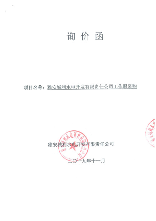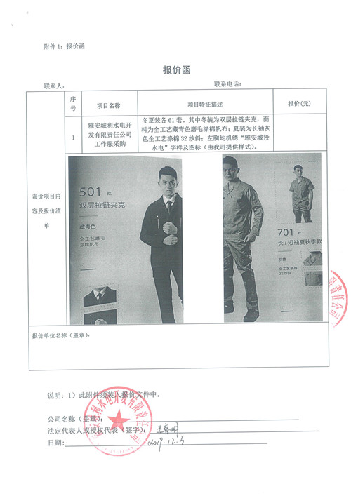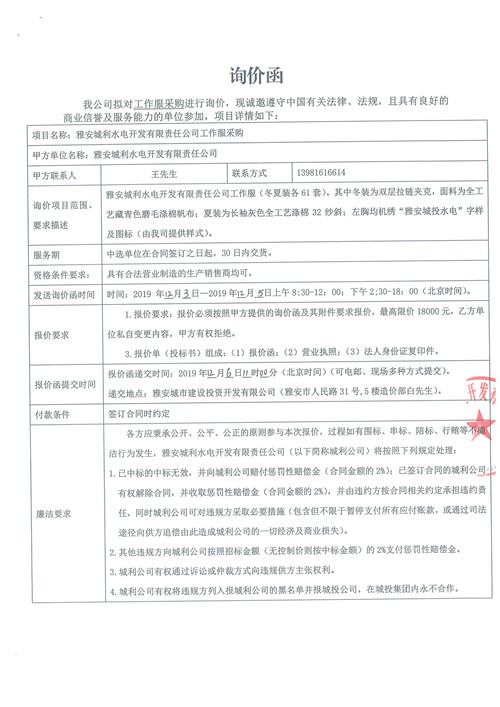 雅安城利水電開發(fā)有限責任公司工作服采購詢價函