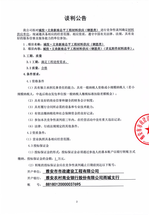市政公司城投·文曲新座總平工程材料供應(鋼筋類)競爭性談判公告