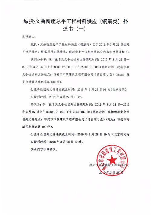 城投·文曲新座總平工程材料供應(yīng)(鋼筋類)競爭性談判公告補遺一