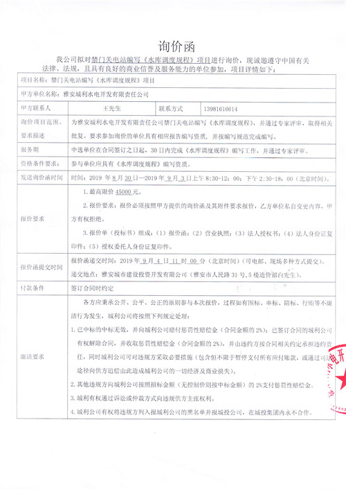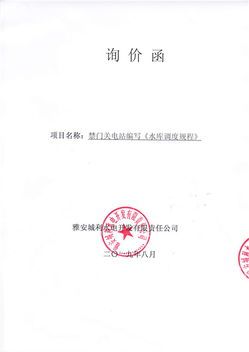 雅安城利水電開發(fā)有限責(zé)任公司禁門關(guān)電站編寫《水庫(kù)調(diào)度規(guī)程》競(jìng)爭(zhēng)性談判公告