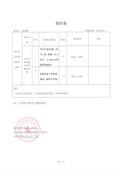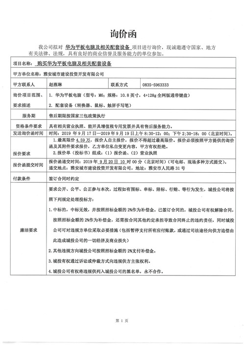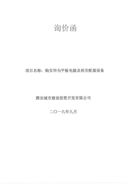 城投公司購買華為平板電腦及相關(guān)配套設(shè)備詢價函