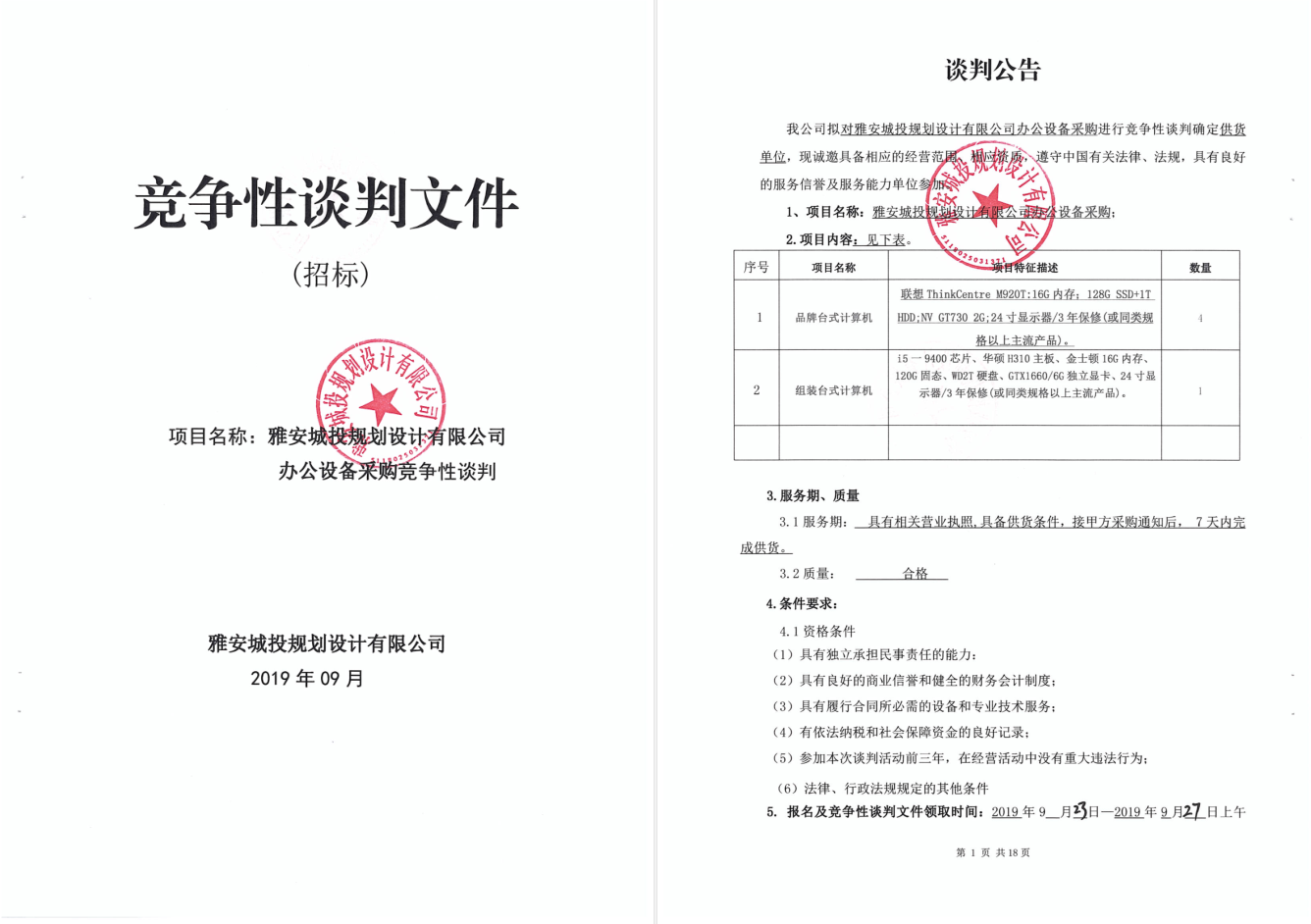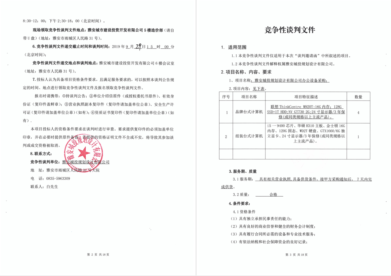 雅安城投規(guī)劃設計有限公司辦公設備采購進行競爭性談判的公告