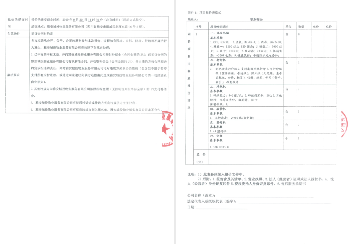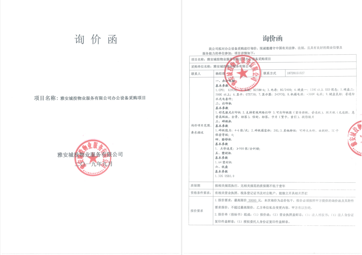 雅安城投物業(yè)服務有限公司辦公設備采購項目