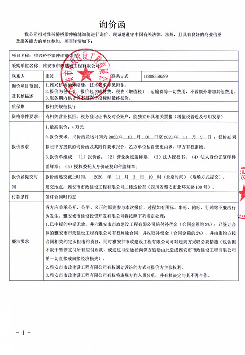 雅安市市政建設(shè)工程有限公司雅興橋橋梁伸縮縫詢價函