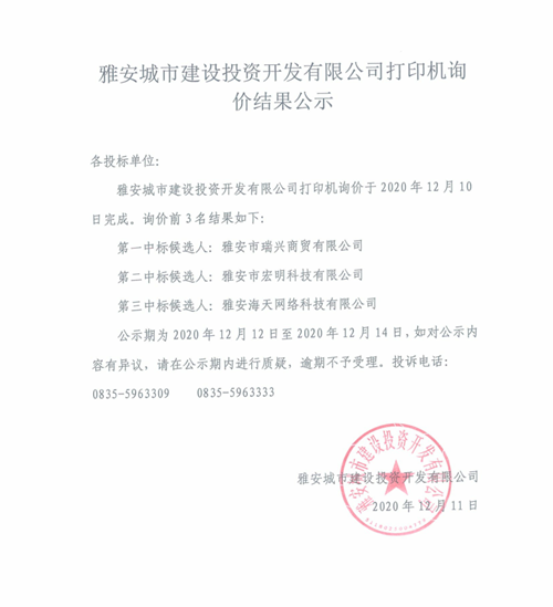 雅安城市建設(shè)投資開(kāi)發(fā)有限公司打印機(jī)詢(xún)價(jià)結(jié)果公示