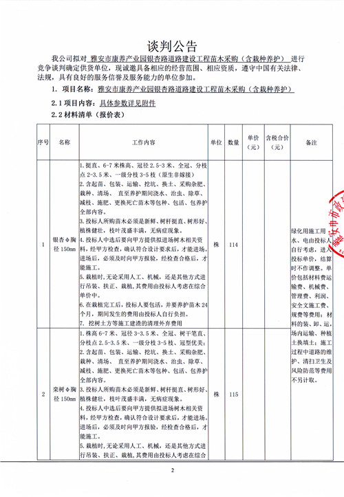 雅安市康養(yǎng)產(chǎn)業(yè)園銀杏路道路建設(shè)工程苗木采購(含栽種養(yǎng)護(hù))談判公告
