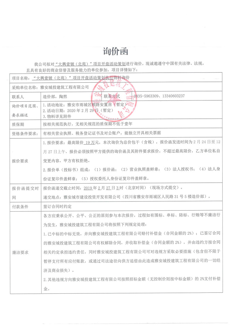 “大興壹號(hào)(北苑)”項(xiàng)目開盤活動(dòng)策劃詢價(jià)函