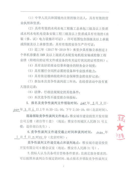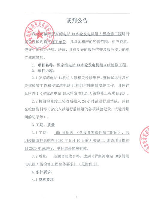 城利水電公司羅家灣電站1#水輪發(fā)電機(jī)組A級檢修工程競爭性談判公告