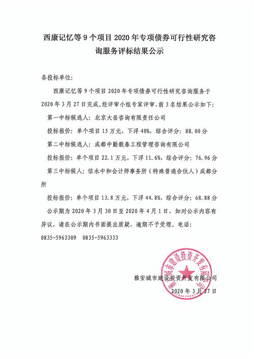 西康記憶等9個項目2020年專項債券可行性研究咨詢服務評標結果公示