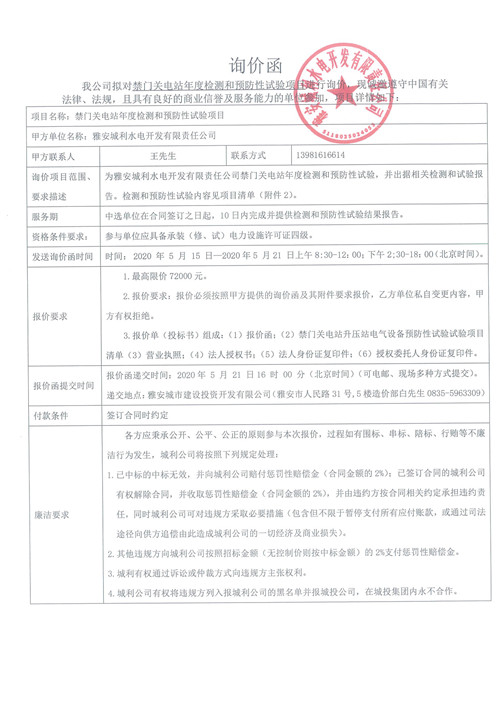 城利水電公司禁門關(guān)電站年度檢測和預(yù)防性試驗項目詢價函