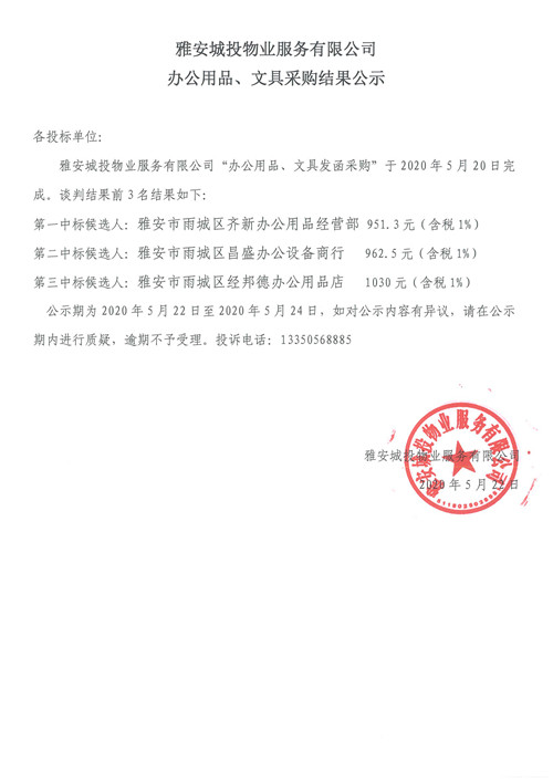 城投物業(yè)公司辦公用品、文具采購(gòu)結(jié)果公示
