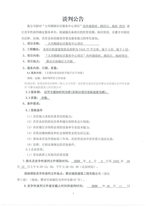 城投建工公司“大興順路社區(qū)服務(wù)中心項(xiàng)目”內(nèi)外墻瓷磚、路沿石、地磚供應(yīng)競爭性談判公告(第二次)