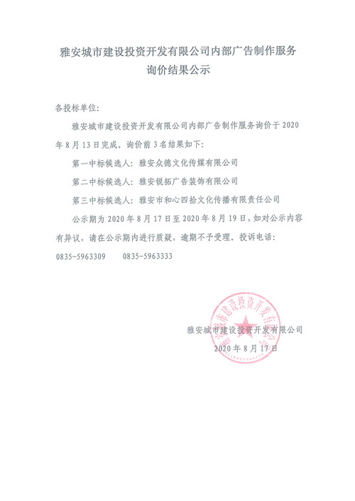 雅安城市建設(shè)投資開發(fā)有限公司公司內(nèi)部廣告制作服務(wù)詢價結(jié)果公示