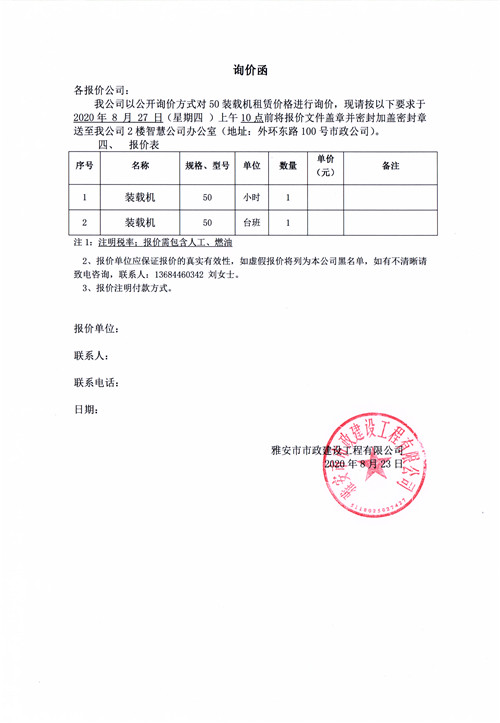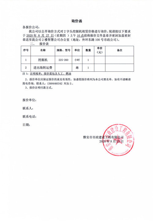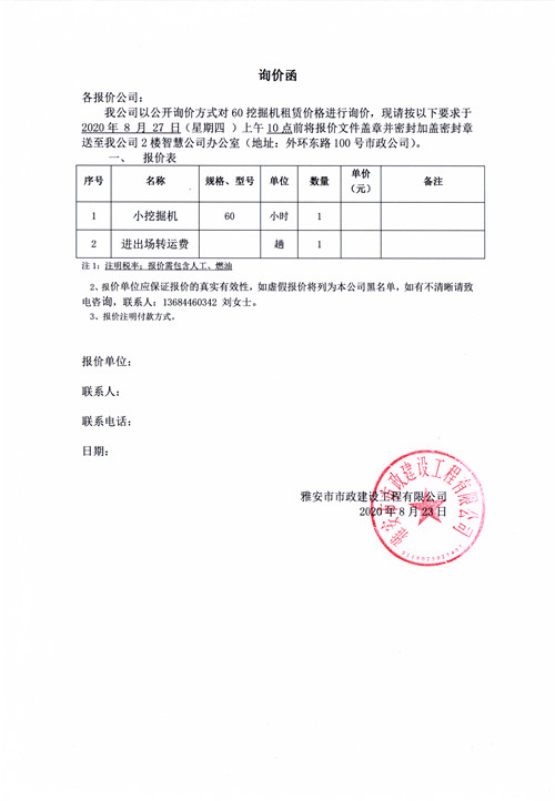 雅安市市政建設(shè)工程有限公司挖掘機(jī)租賃詢價函