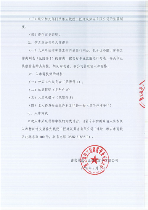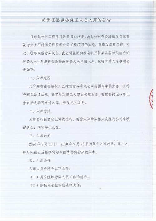 雅安城投工匠建筑勞務(wù)有限公司關(guān)于征集勞務(wù)施工人員入庫(kù)的公告
