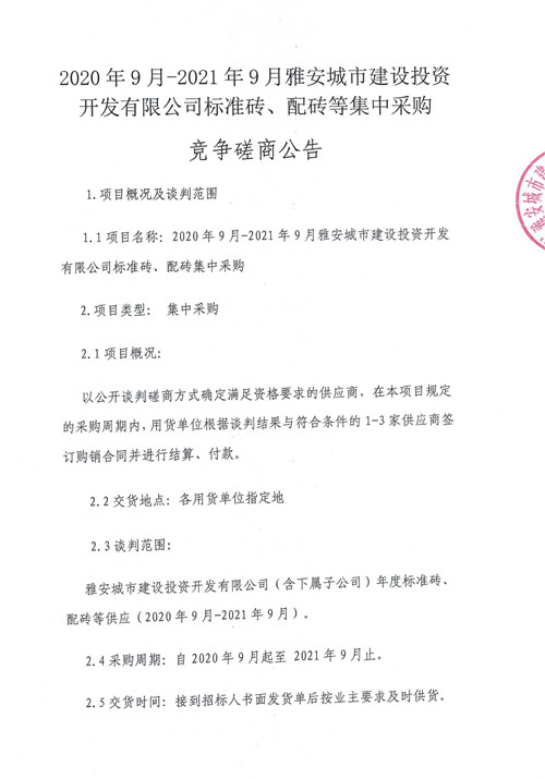 2020年9月-2021年9月雅安城市建設(shè)投資開發(fā)有限公司標(biāo)準(zhǔn)磚、配磚等集中采購競(jìng)爭(zhēng)磋商公告
