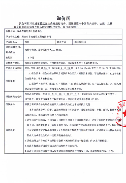 市政公司雙橋車轉(zhuǎn)運棄土價格詢價函