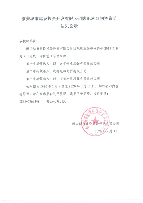 雅安城市建設(shè)投資開(kāi)發(fā)有限公司防汛應(yīng)急物資詢(xún)價(jià)結(jié)果公示
