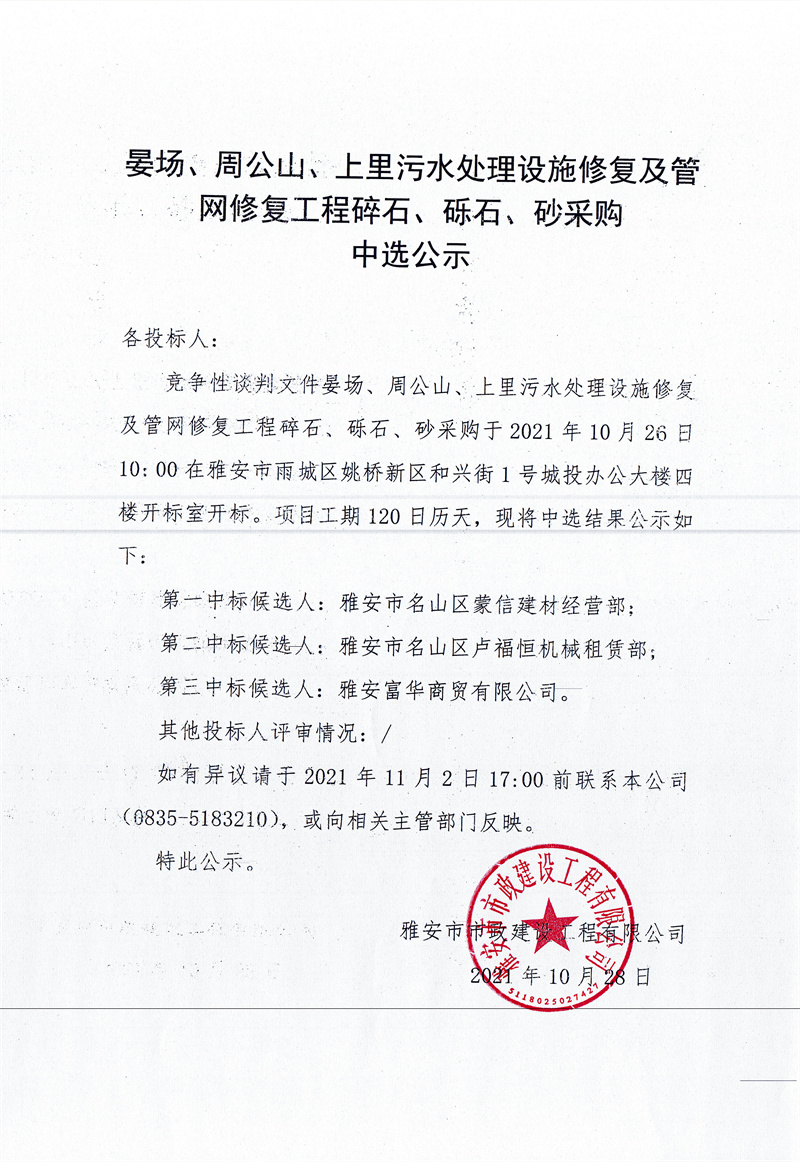 晏場、周公山、上里污水處理設(shè)施修復(fù)及管網(wǎng)修復(fù)工程碎石、礫石、砂采購中選公示