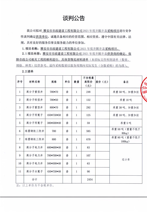 雅安市市政建設(shè)工程有限公司2021年井圈井蓋采購項(xiàng)目競爭性談判公告