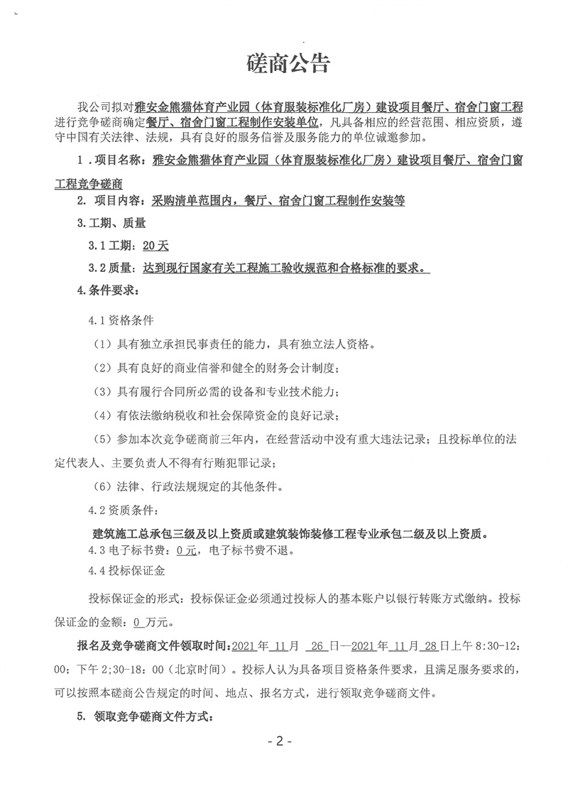 雅安金熊貓體育產(chǎn)業(yè)園(體育服裝標準化廠房)建設(shè)項目餐廳、宿舍門窗工程競爭磋商公告
