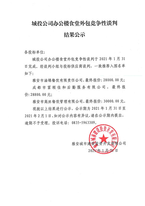 城投公司辦公樓食堂外包競爭性談判結(jié)果公示