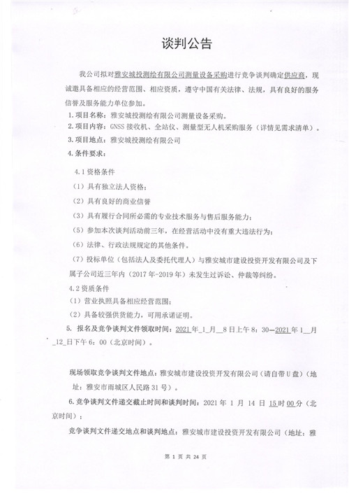 雅安城投測(cè)繪有限公司測(cè)量設(shè)備采購(gòu)競(jìng)爭(zhēng)性談判公告