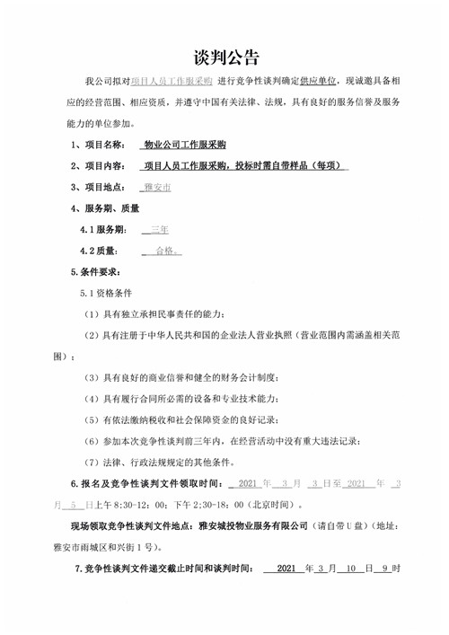 城投物業(yè)公司項(xiàng)目人員工作服采購(gòu)競(jìng)爭(zhēng)性談判公告