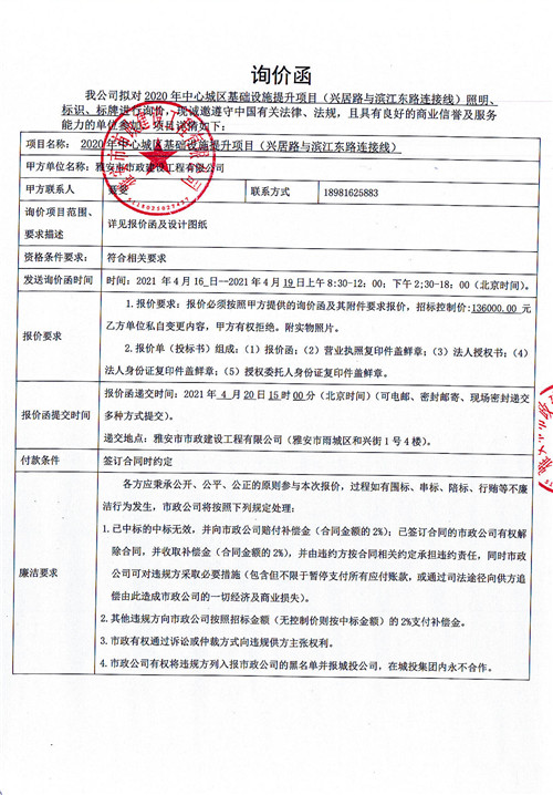 雅安市政公司2020年中心城區(qū)基礎(chǔ)設(shè)施提升項目(興居路與濱江東路連接線)照明、標識、標牌詢價函