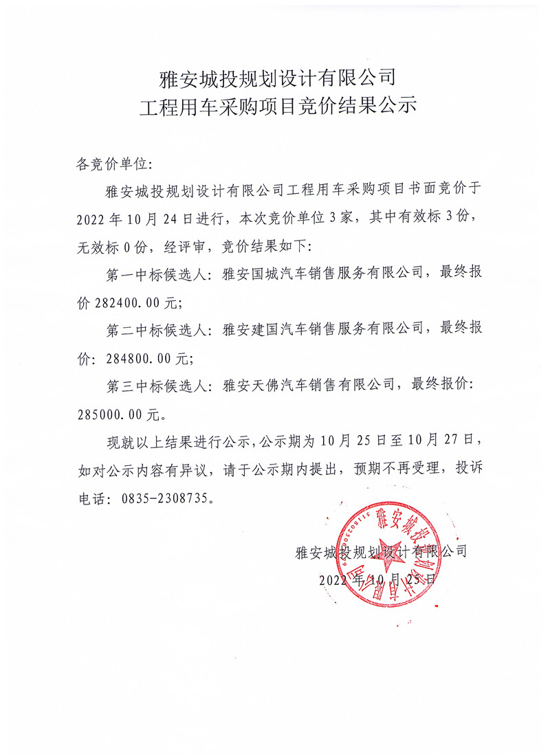 雅安城投規(guī)劃設(shè)計(jì)有限公司工程用車采購項(xiàng)目競價(jià)結(jié)果公示