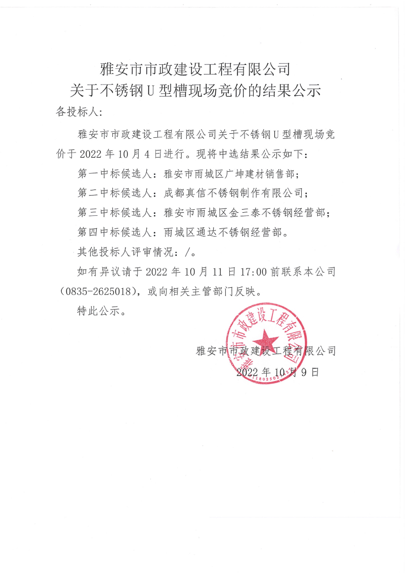 關(guān)于不銹鋼U型槽進(jìn)行現(xiàn)場(chǎng)競(jìng)價(jià)的結(jié)果公示