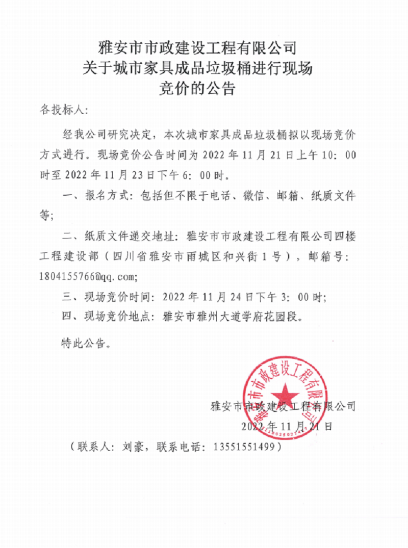 雅安市市政建設工程有限公司關(guān)于城市家具成品垃圾桶進行現(xiàn)場競價的公告