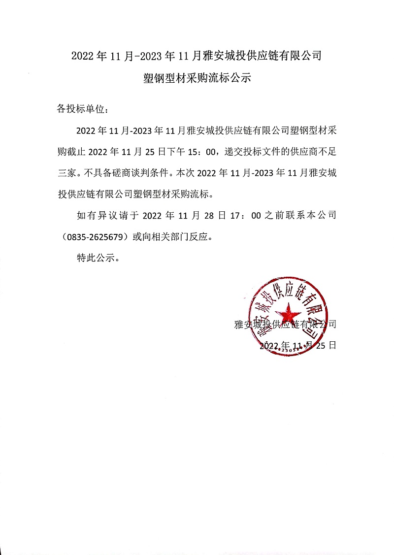 2022年11月-2023年11月雅安城投供應(yīng)鏈有限公司塑鋼型材采購流標(biāo)公示