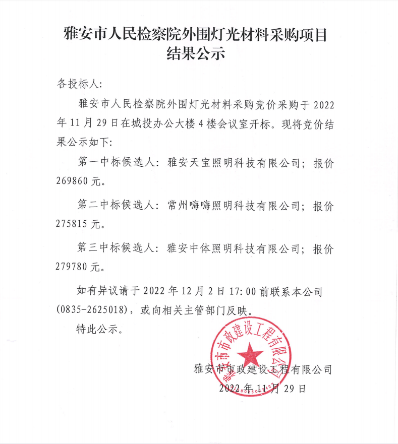 雅安市人民檢察院外圍燈光材料采購(gòu)項(xiàng)目結(jié)果公示
