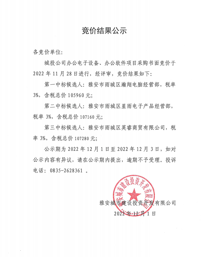 雅安城市建設投資開發(fā)有限公司辦公電子設備、辦公軟件項目采購競價結果公示