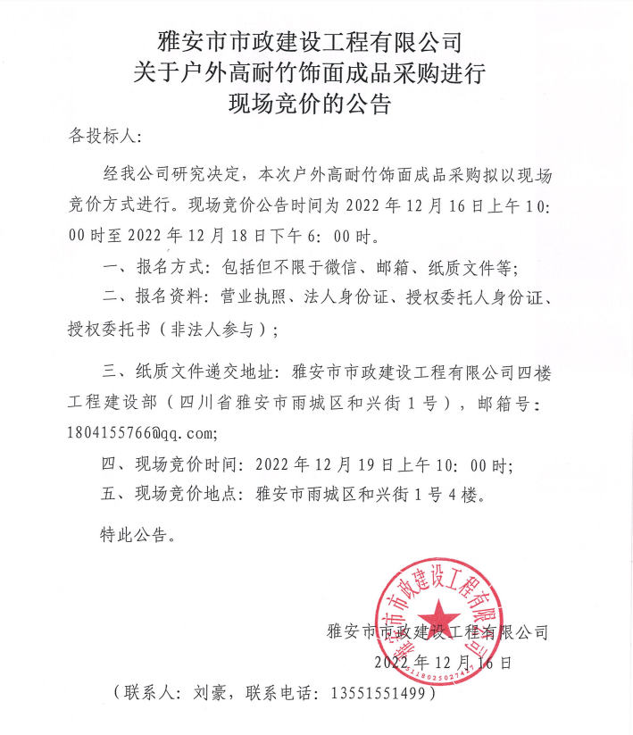 雅安市市政建設(shè)工程有限公司關(guān)于戶外高耐竹飾面成品采購進(jìn)行現(xiàn)場競價公告