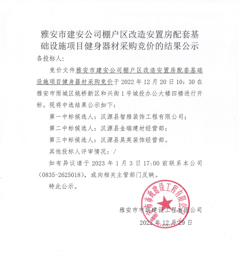 雅安市建安公司棚戶區(qū)改造安置房配套基礎(chǔ)設(shè)施項(xiàng)目健身器材采購競價(jià)結(jié)果公示