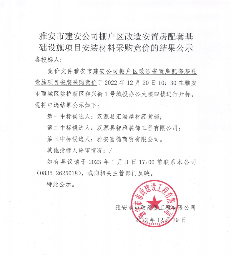 雅安市建安公司棚戶區(qū)改造安置房配套基礎(chǔ)設(shè)施項(xiàng)目安裝材料采購競價結(jié)果公示