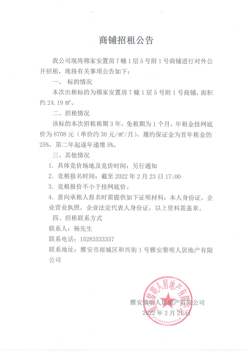 穆家安置房7幢1層5號附1號商鋪招租公告