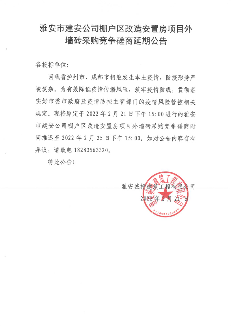 雅安市建安公司棚戶區(qū)改造安置房項目外墻磚采購競爭磋商延期公告