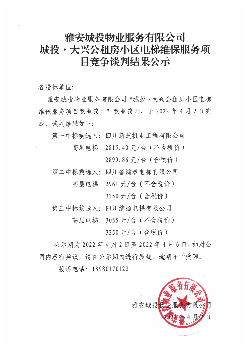 城投·大興公租房小區(qū)電梯維保服務(wù)項目競爭談判結(jié)果公示