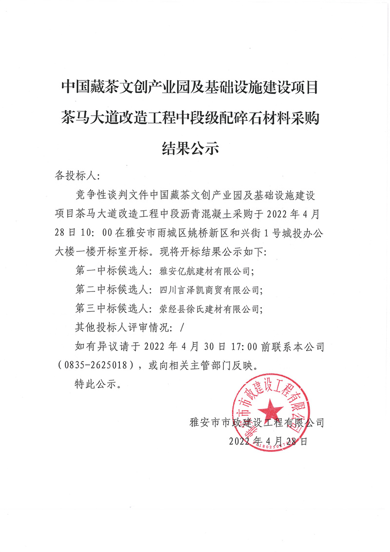 中國藏茶文創(chuàng)產(chǎn)業(yè)園及基礎設施建設項目茶馬大道改造工程中段級配碎石材料采購結果公示