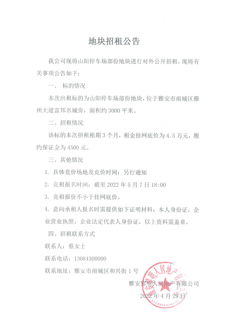 黎明人居公司山陽停車場部分地塊招租公告