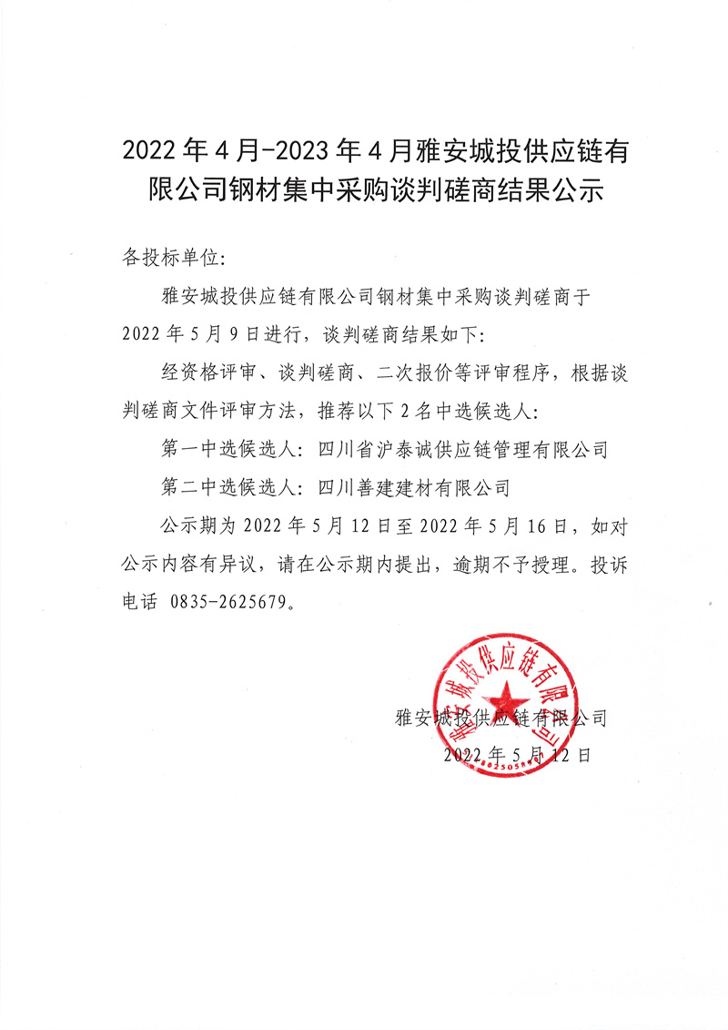 2022年4月-2023年4月雅安城投供應(yīng)鏈有限公司鋼材集中采購(gòu)談判磋商結(jié)果公示
