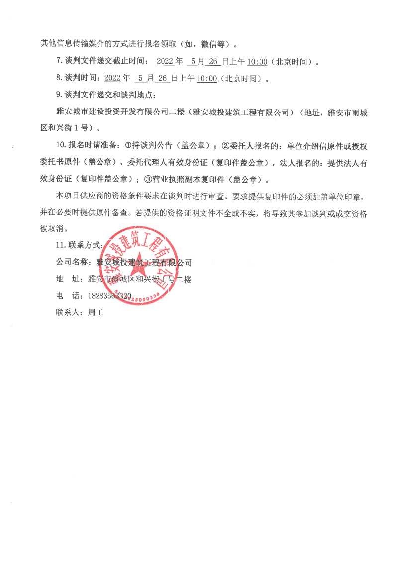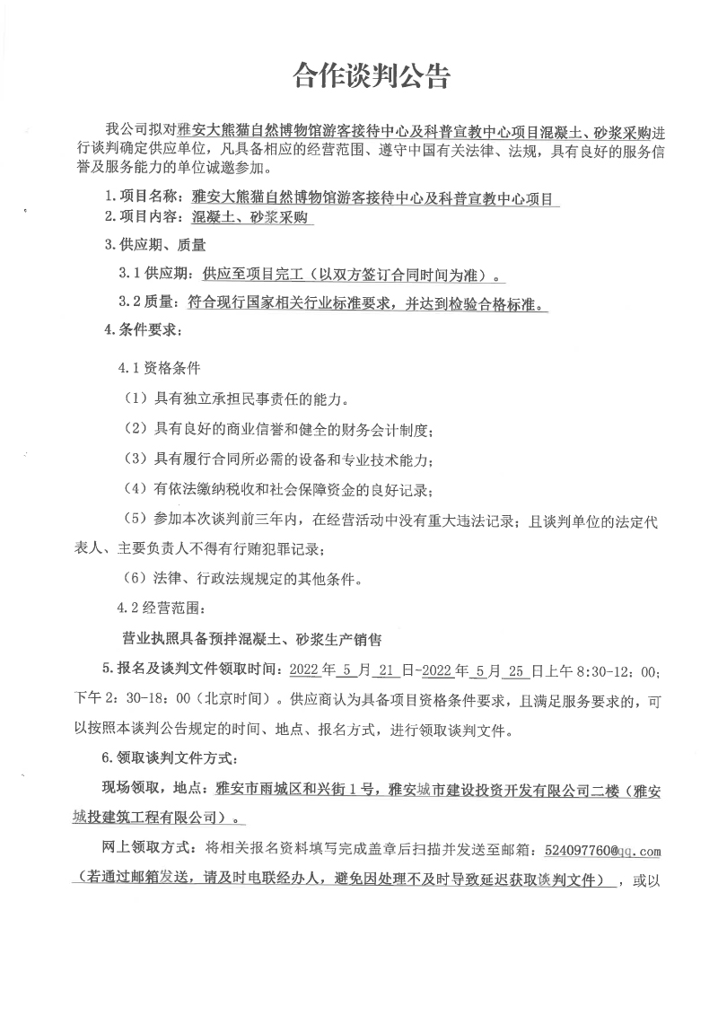 雅安大熊貓自然博物館游客接待中心及科普宣教中心項目混凝土、砂漿采購合作談判公告