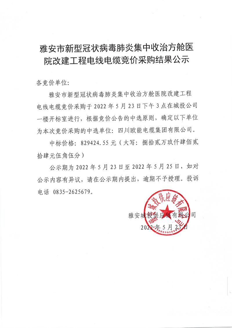 雅安市新型冠狀病毒肺炎集中收治方艙醫(yī)院改建工程電線電纜采購競價(jià)采購結(jié)果公示
