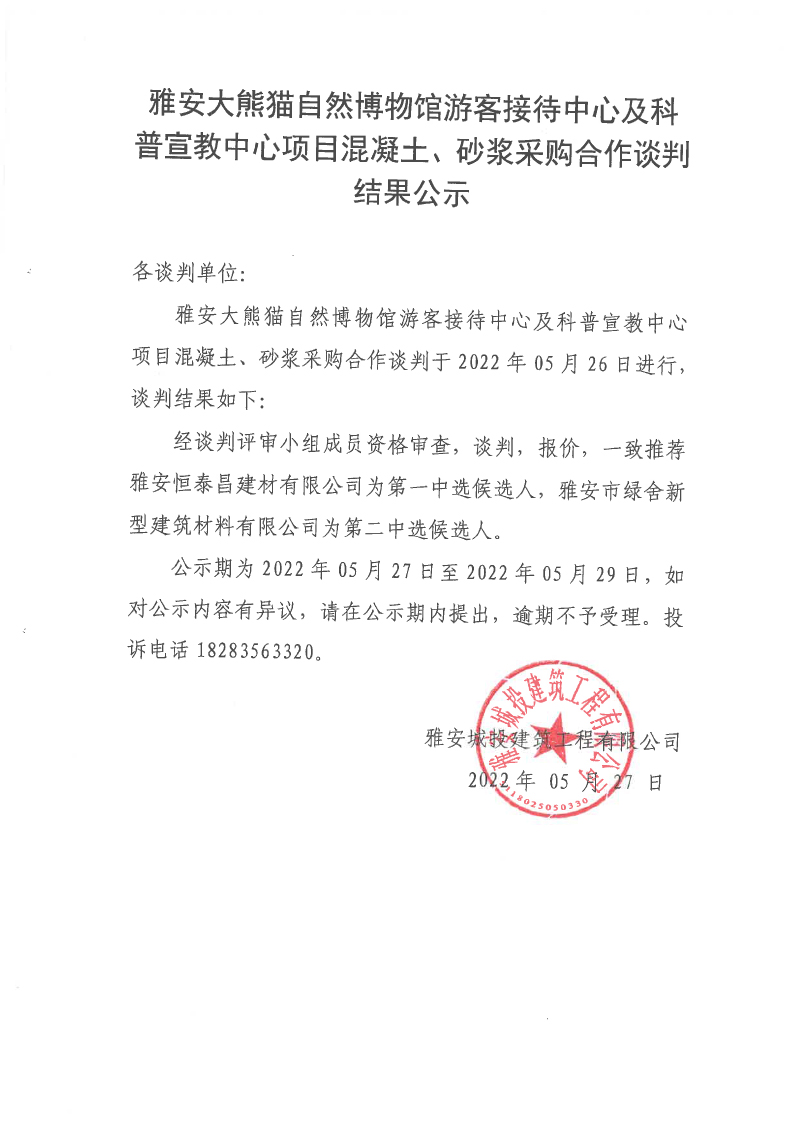 雅安大熊貓自然博物館游客接待中心及科普宣教中心項(xiàng)目混凝土、砂漿采購合作談判結(jié)果公示