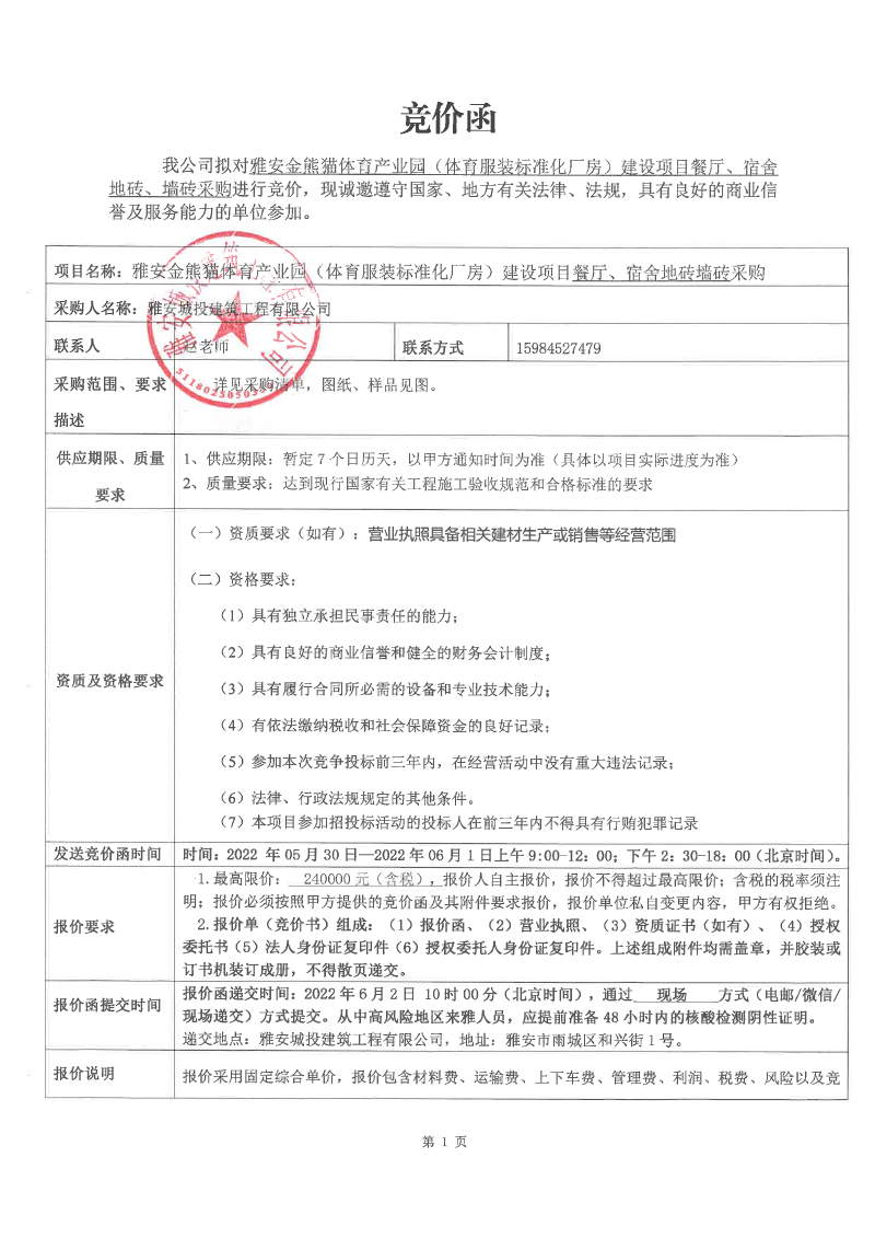 雅安金熊貓體育產(chǎn)業(yè)園(體育服裝標準化廠房)建設(shè)項目餐廳、宿舍地磚、墻磚競價采購